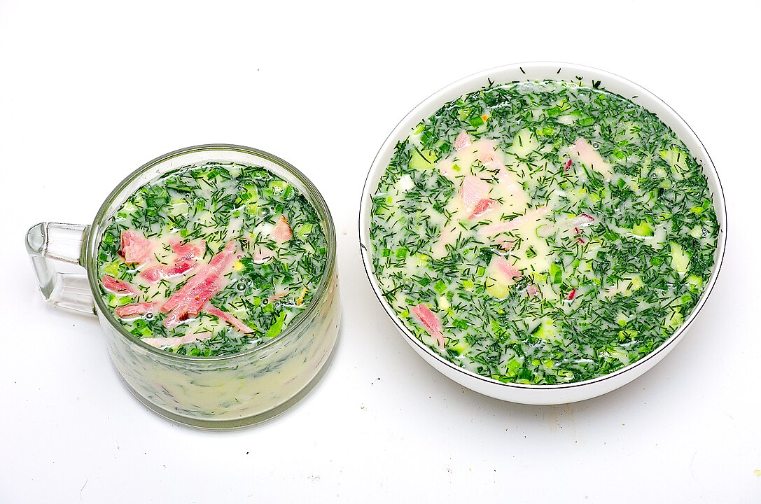 - Мелко порубленные продукты (мясо — кубиками или полосками) заливаются квасом, при желании сдабриваются сметаной (можно — жирными сливками) и подаются на стол порционно в глубоких тарелках.