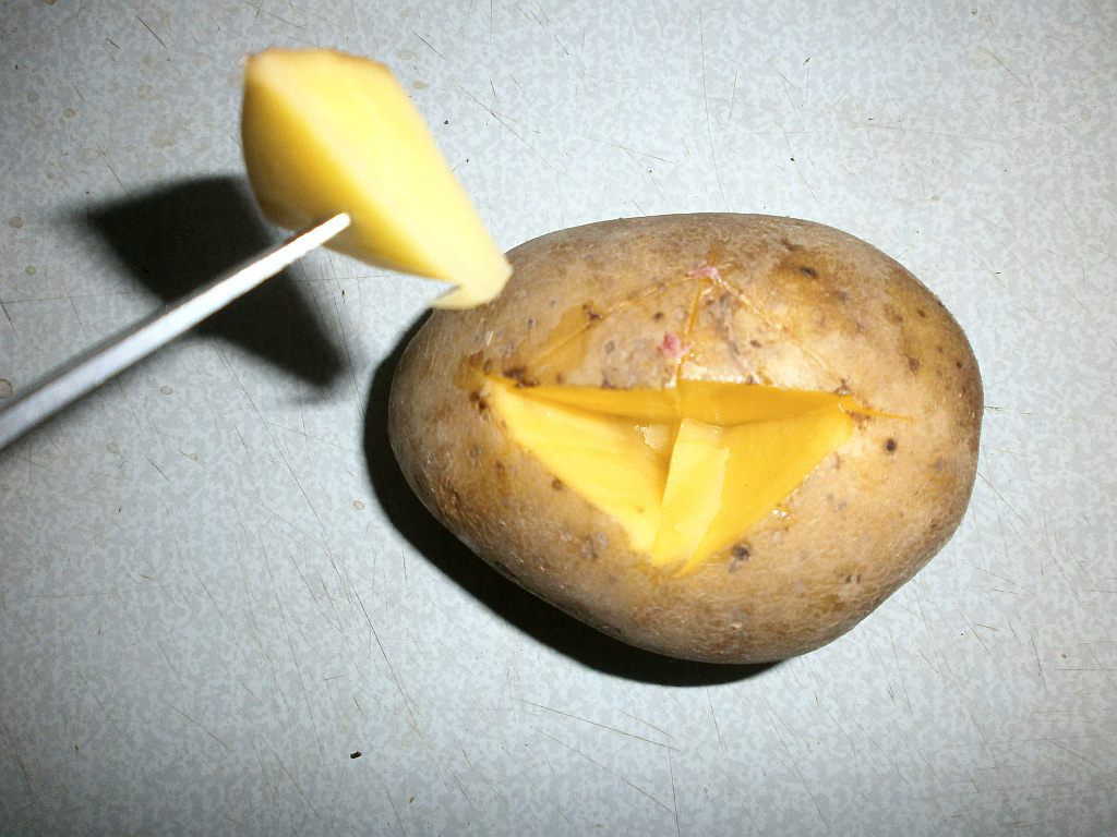 В очищенном картофеле с помощью ножа или иного формовочного кулинарного инструмента вырезают фигурное углубление.