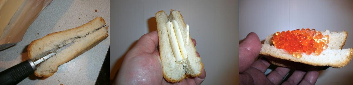 Затем, не давая остыть, в прорезь тоста кладут сливочное масло, икру или другие «вкусности». На стол подают тут же — горячим.