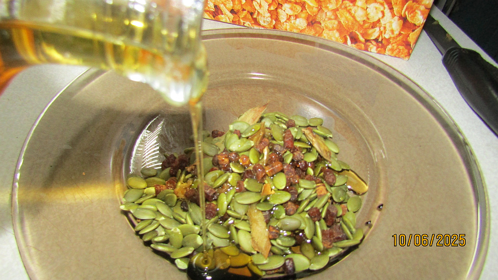 Способ приготовления. На десертную тарелку выкладывают тыквенные семечки, пчелиный хлеб, нарезанный или протертый корень имбиря, заливают всё сиропом топинамбура и тщательно перемешивают. Продукт сразу готов к употреблению.