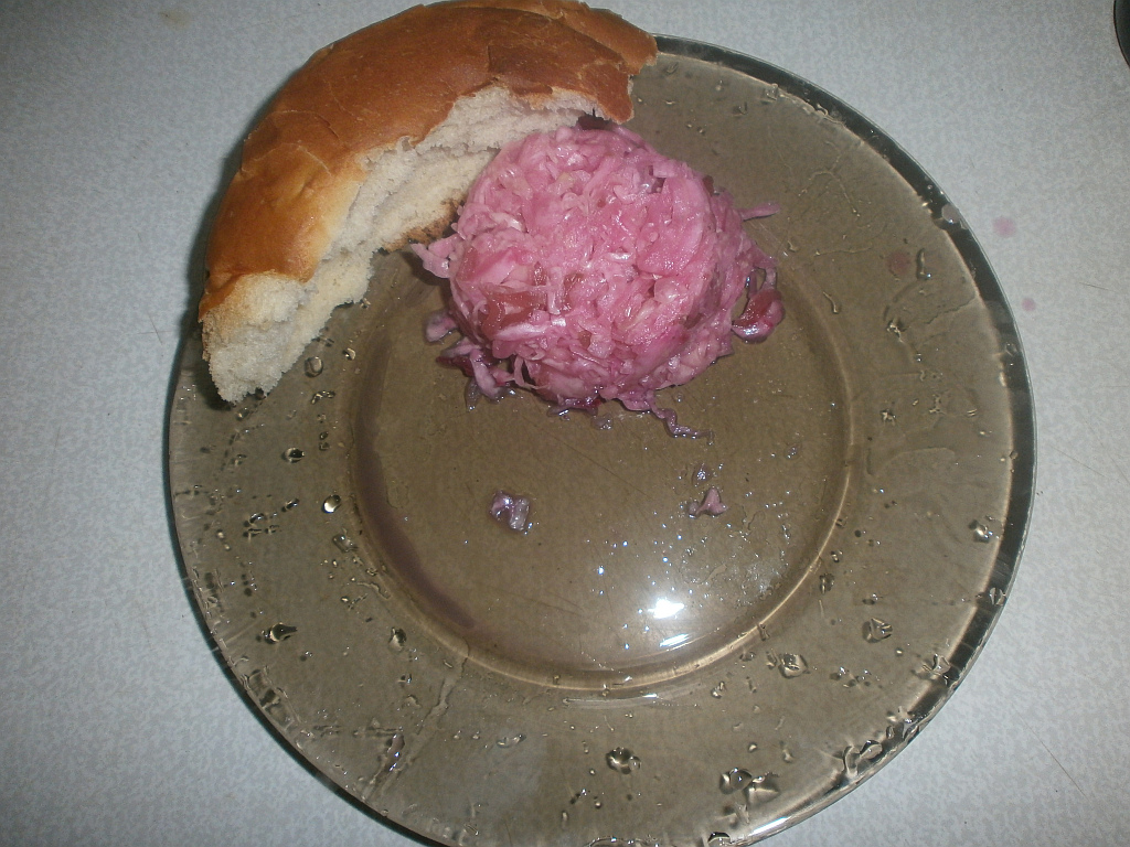 Сначала на тарелку выкладывают «холодные» ингредиенты: салат из белокочанной капусты и лаваш. Особенность блюда также и в форме ингредиентов: салат из капусты делают с помощью специальной формочки, чтобы получилась порционная модель, напоминающая тетраэдр. Такой порционный «блок» на тарелке придает блюду особенный стиль и возбуждает аппетит.
