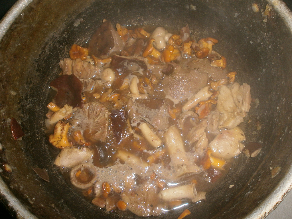 Одновременно с этим, но в разной посуде, жарят мясо и грибы.
