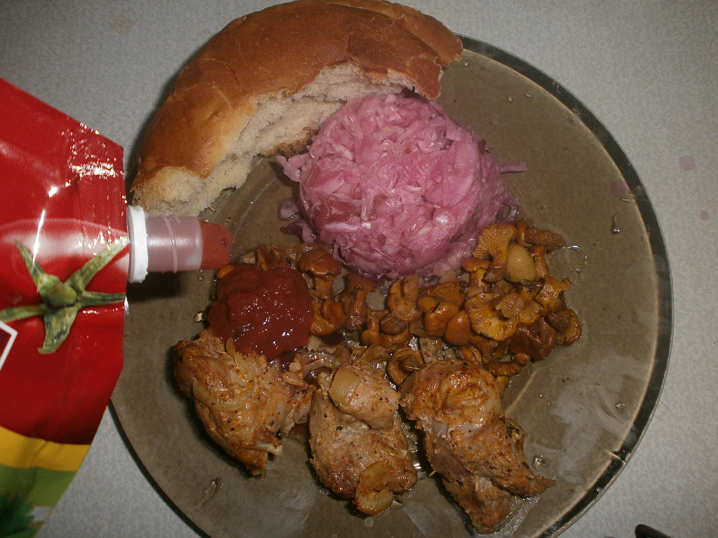 Мясо и грибочки — как элемент жаркого — выкладывают на тарелки в последнюю очередь и сразу подают к столу. При этом заливая томатным соусом или кетчупом с краю или в середине блюда.