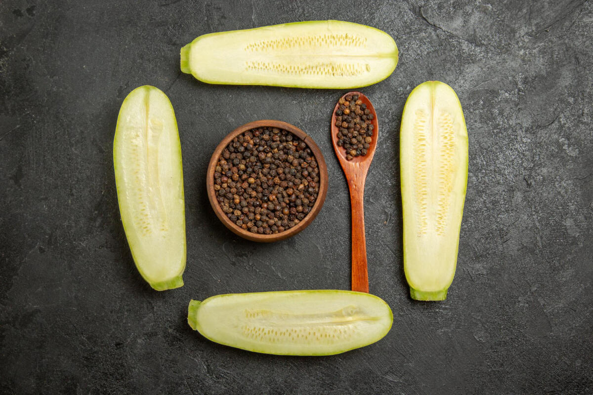 Можно придерживаться классики — укроп, лавровый лист, привычный вкус лета в банке. А можно рискнуть и добавить кориандр, куркуму или немного острого перца: кабачок легко примет на себя их яркие ноты.