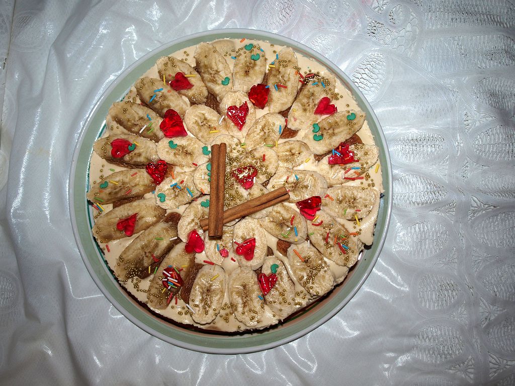 Затем два очищенных банана нарезают на равные ломтики овальной формы толщиной не более 0,5 см и выкладывают последним слоем.