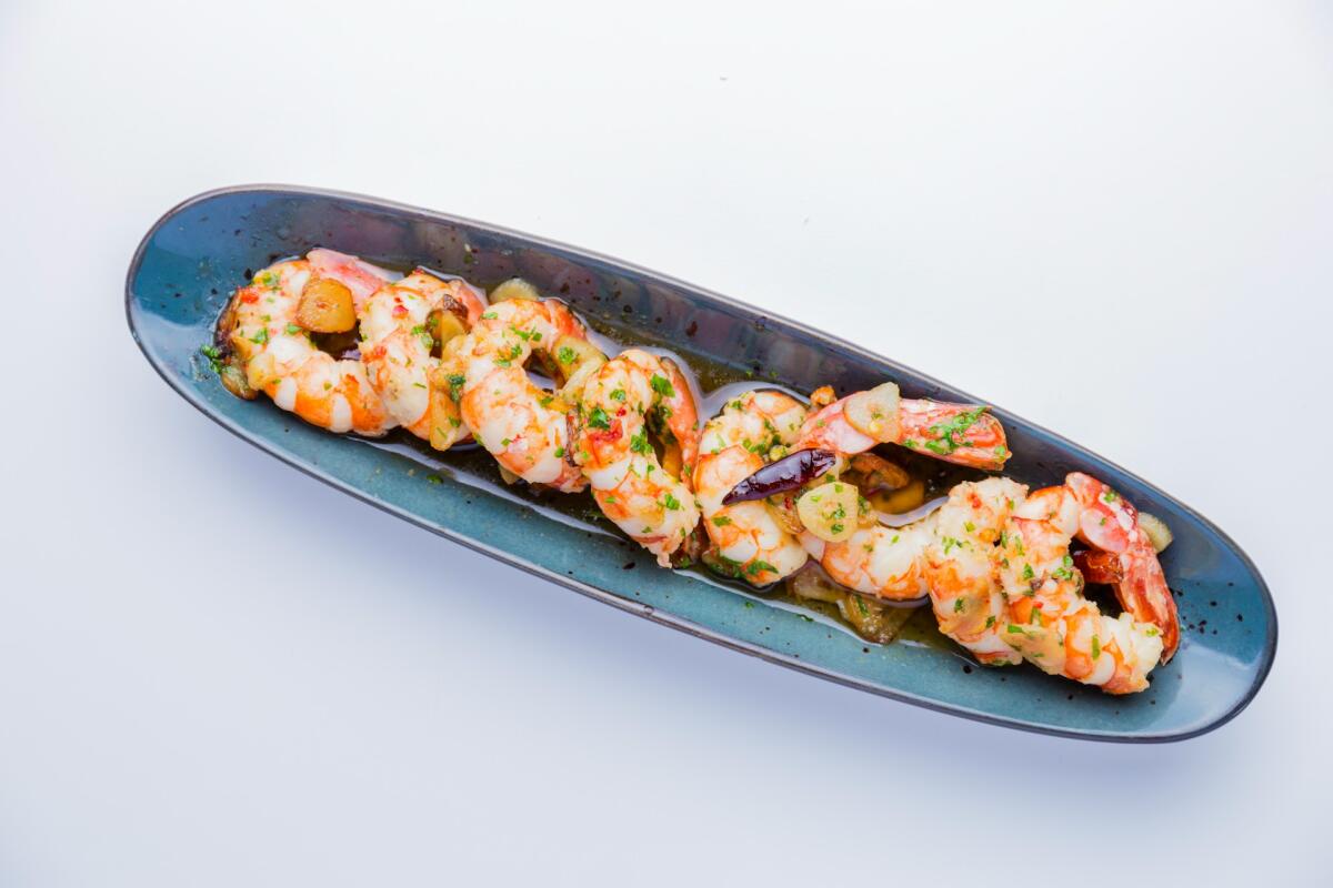 Уложив креветки на подогретые порционные тарелки, заливаем соусом и оформляем блюдо зеленью, лимоном, маслинами — по желанию.