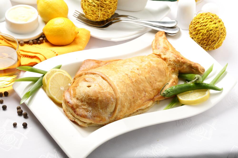 Готовую кулебяку достаньте из духовки, сбрызните холодной кипяченой водой и накройте салфеткой. Дайте кулебяке «отдохнуть» и подавайте, украсив зеленью и ломтиками лимона, на стол к рыбному бульону, ухе, а также как закуску (тогда к кулебяке подают сметану). Красиво, вкусно, и на стол поставить не стыдно. Смело можно добавлять кулебяку в копилку новогодних рецептов.