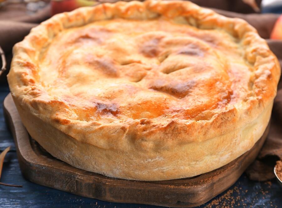 Выложите готовую начинку на пласт теста, разровняйте, накройте более тонким пластом, выведите края кверху, аккуратно защипните их и декоративно закрутите швы. Наколите пирог вилкой в нескольких местах. Заварите крепкий чай и обильно смажьте (но не полейте!) им поверхность пирога.