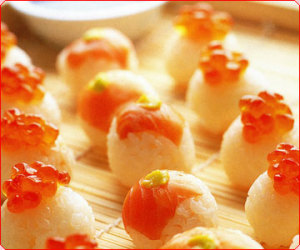 — И наконец-то, наконец (!) выкладываем суши на блюдо, посыпаем мелко-премелко нарезанным имбирем и торжественно водружаем блюдо на стол. Отдельно подаём соевый соус! — Снова быстро надеваем кимоно, берём веера и с японской песней и поклонами семеним к столу!