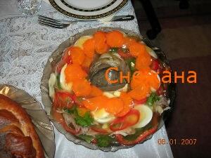А можно пойти по другому пути: каждый накрывает свой стол целиком своими любимыми фирменными блюдами, но это задание намного легче. Тока так: да и нет не говорите - никаких оливье-блевье и селедок под дохами. И так, чтобы продукты используемые можно любому купить по доступной цене и повторить у мебя дома. Маришка Дутти уже дорожку проторила. А мы вместо бала или до или после бала покормим чем-то. И начинать надо прямо с начала декабря печатать эти кулинарные штуки. А на это надо согласование с редакцией, чтобы выделили тематический резерв в плане. В общем, давайте сначала сами определимся по какому сценарию пойдем. а потом уже будем редактору голову морочить. Заметано? Тогда у кого-то в блоге, да хоть у Жанны, давайте тему перетрем и попросим редакцию открыть конкурс тематический в разделе редколлегия, чтобы все ребята могли прочитать и присоединиться. Думаю, что надо разрешить пользоваться заимствованными рецептами и особо поощрять нацональные кухни, чтобы не только россияне играли, а все республики. Вот мне приходилось несколько лет отмечать польский Новый год - это же совсем другой стол и другие приметы и мульки. Это уже будет критерий № 3. Обязательно надо будет блюдо-шутку-сюрприз. Это уже № 4 критерий. Думать всем!