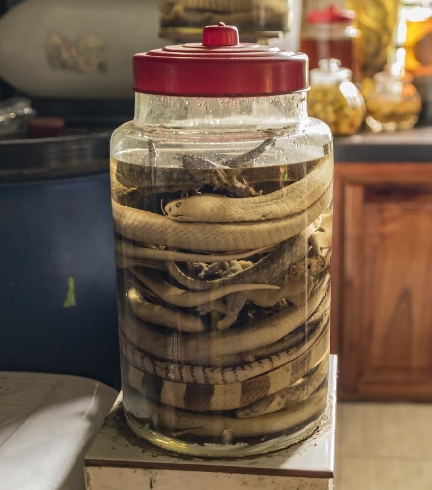 Там же есть семнадцать указанных в меню видов змеиного вина, как и множество ещё таких же невиданных и неслыханных блюд, так что посетители бывают просто ошарашены ассортиментом экзотики.