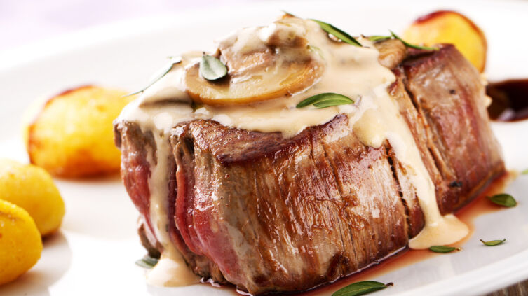 На красивое плоское блюдо выложите мясо, облейте его соусом так, чтобы ни один кусочек не был обижен грибной подливкой. Прямо на мясо, по внешней его границе, черенками кнутри выложите листики мяты примерно одинакового размера. В центр блюда поместите верхушку мятного растения в виде кустика.
