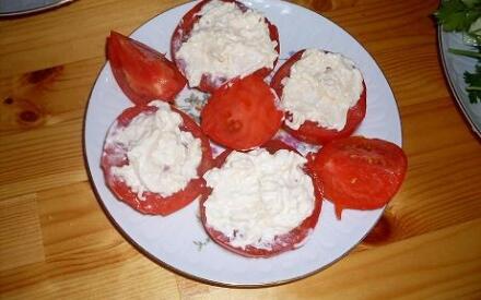 Помидоры разрезаем на половинки или режем на толстые кружочки. Сыр натираем на терке и смешиваем с тертым чесноком и майонезом. Помидоры слегка присаливаем и выкладываем на них сырно-чесночную смесь. Можно украсить зеленью, но без неё получается как раз таки бело-красный «Спартак».