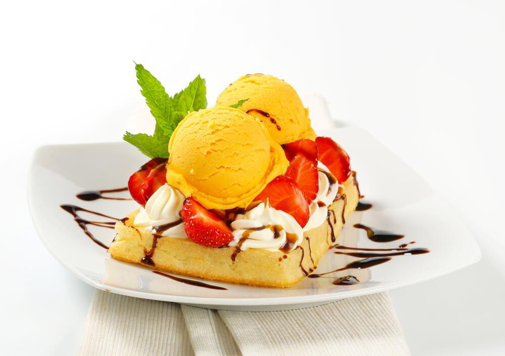 Рецепт десерта: шарики мороженого кладут в вазочку или креманку, сверху помещают плоды или ягоды консервированные, посыпают жареным миндалем, можно другими орехами. Взбитые сливки выпускают из кондитерского мешка (конверта) вокруг плодов и ягод.