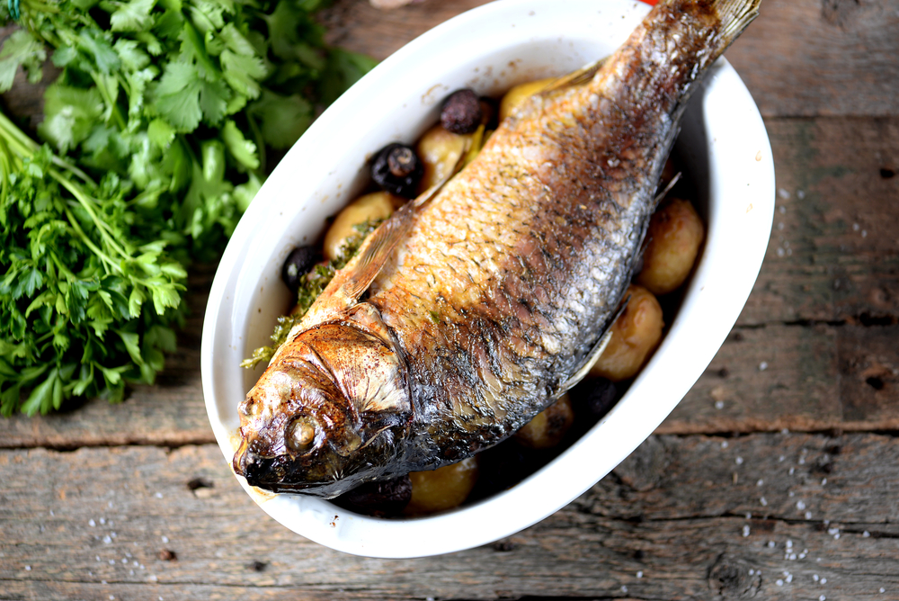Вымыв и обсушив полотняной салфеткой карпа, натираем его солью и перцем. Отрезав от приготовленной половинки лимона 2 ломтика, разрезаем каждый из них пополам. В одном (!) боку карпа делаем небольшие надрезы (под углом 45 градусов) и вставляем туда эти половинки ломтиков лимона. Из оставшегося лимона выжимаем сок, поливая им карпа.
