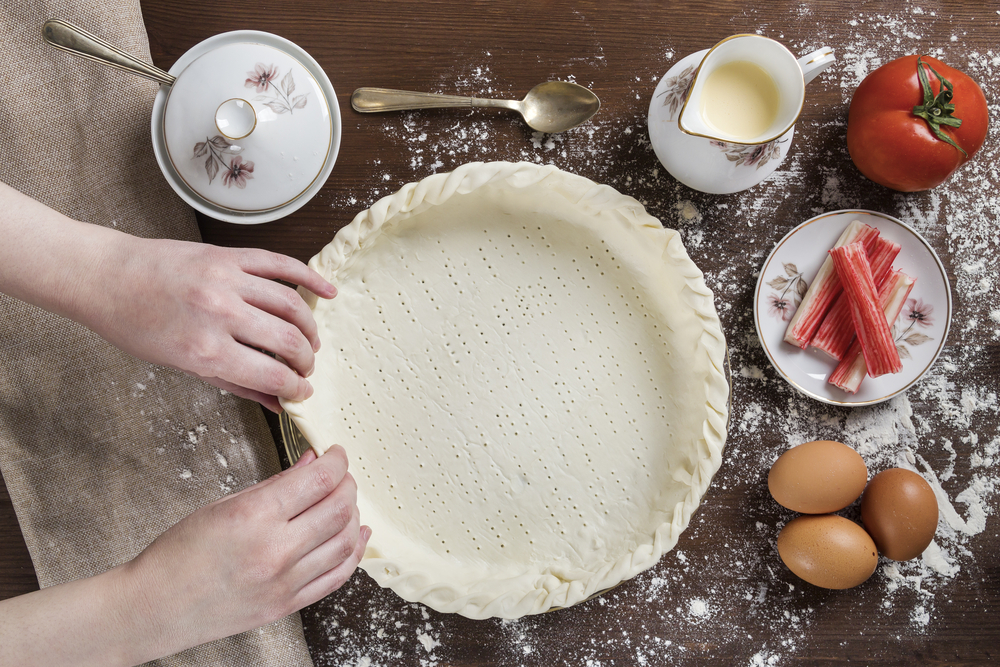 Слоеное тесто раскатываем в пласт и нарезаем полосками шириной 1−2 см. Каждую крабовую палочку обматываем по спирали полоской теста. Ни солить, ни перчить не нужно. Сбрызнув противень водой, выкладываем палочки в тесте, смазываем их сверху растительным маслом или яйцом.