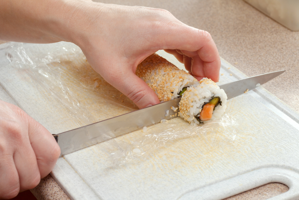 Отваренный и промытый рис ещё теплым смешать с рисовым уксусом. Ровно, тонко и плотно разровнять — рисинка к рисинке, можно на плотной льняной салфетке или на специальном бамбуковом коврике (бывают также для этих целей силиконовые коврики). В серединку выложить огурцы, нарезанные крупной соломкой, плотно скатать, обвалять «рулет» в орехах или кунжутных семечках.