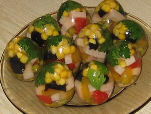 Затем залить содержимое яичных скорлупок овощным отваром с растворенным в нем желатином и поставить в холодильник. Поставить яйца в холодильник до застудневания лучше на ночь, хотя заливное может быть готовым уже и через 2 часа. Перед подачей яйца окунуть в горячую воду на секунду-две (следя, чтоб вода не попала в отверстие в яйце) и затем аккуратно очистить, как обычные вареные яйца.
