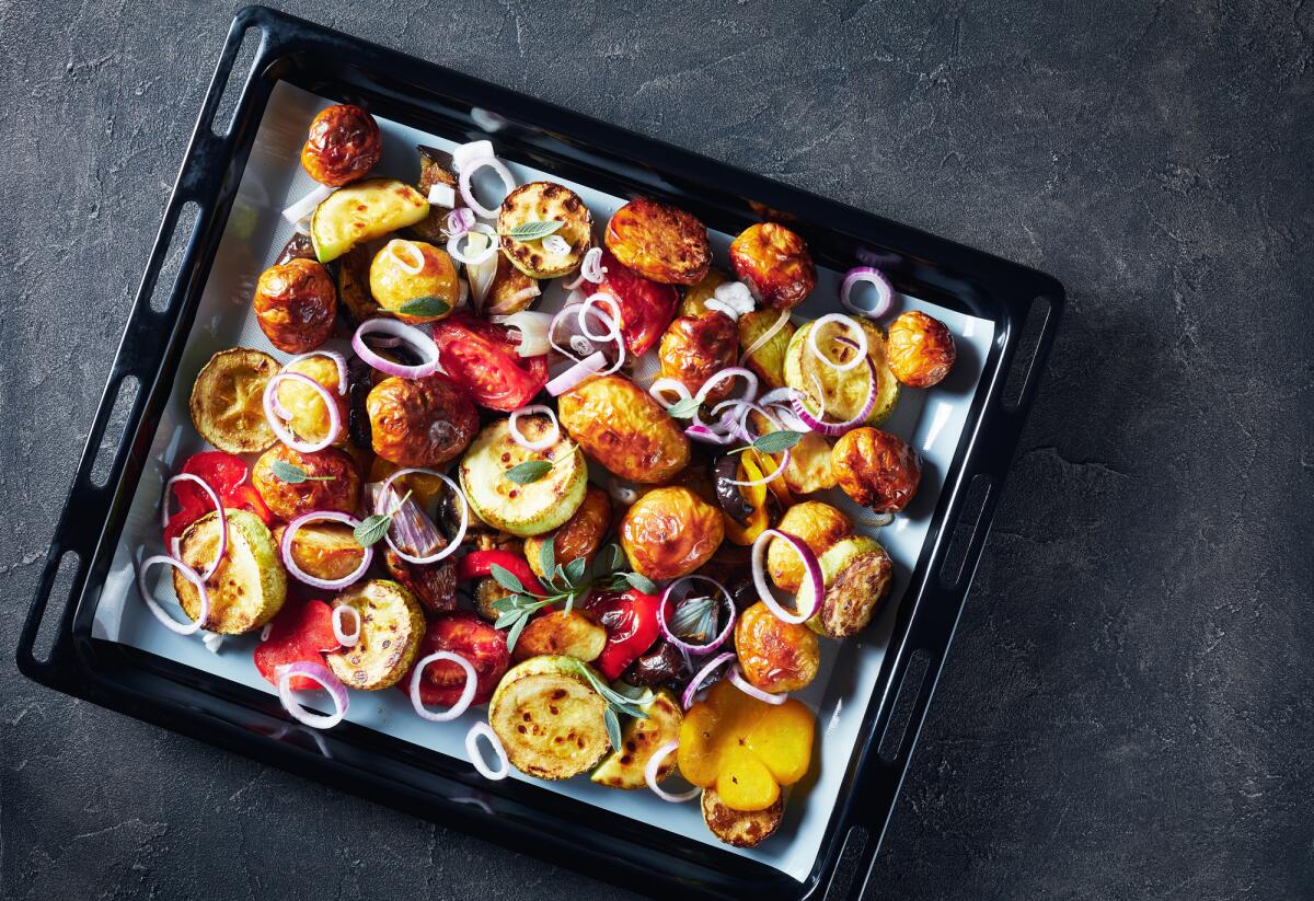 В разогретую до 200 градусов духовку на противень разложить группами овощи, убавить температуру до 180 градусов и печь 25 минут. Перевернуть и снова на 20 минут.