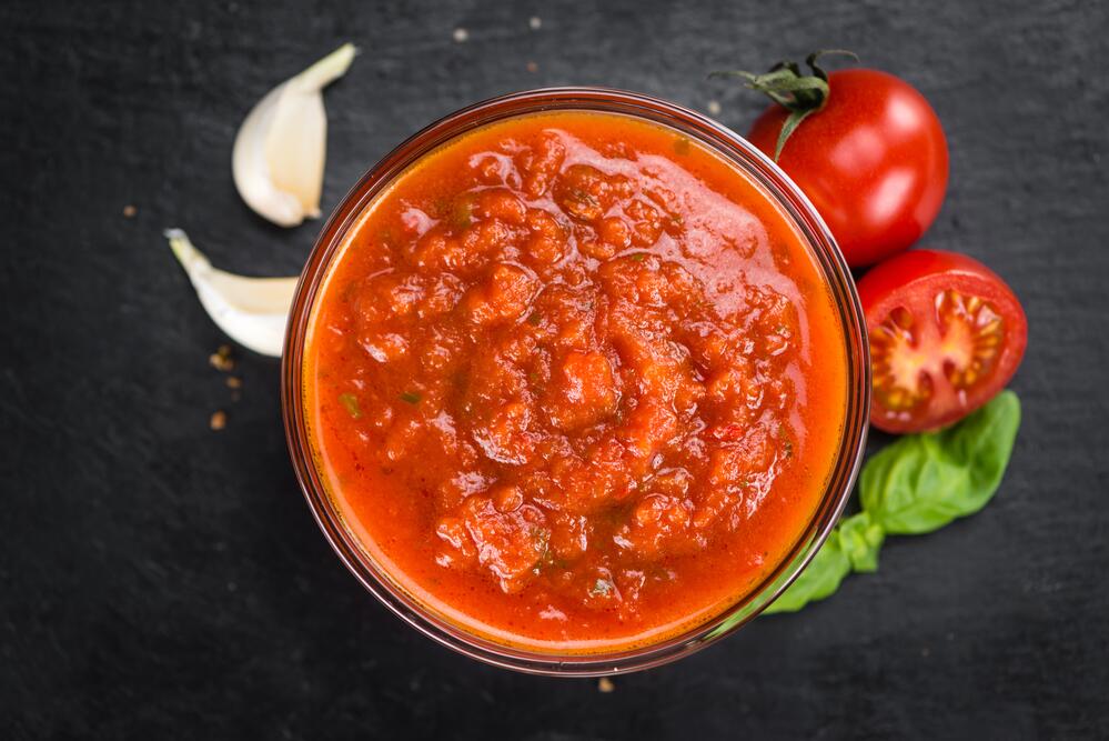 1 кг помидоров, 1 кг красного болгарского перца, 300−500 г чеснока, 2 яблока (антоновка), петрушка — 1 пучок, горький стручковый перец — 2 штуки, молотый кориандр, 250 г соли и 20 г 5%-го уксуса.