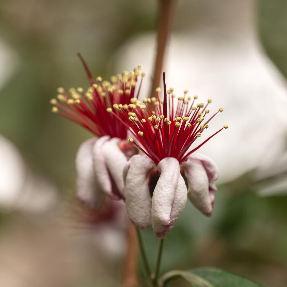 Плоды фейхоа не сразу заметишь в кроне деревца — они даже в зрелом виде имеют зеленоватую окраску и теряются в массе листвы. Внешне они несколько похожи на зеленоватые сливы с пучком коротких хвостиков на конце.