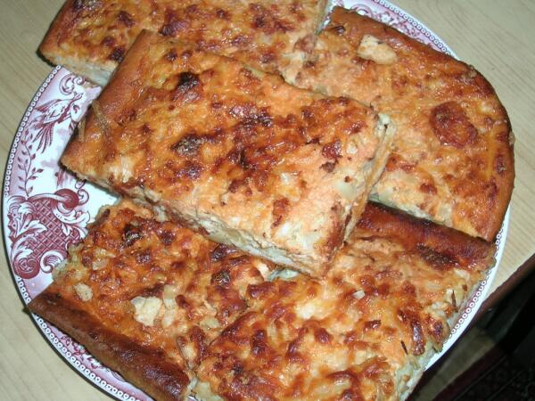 Теперь о фантазиях. Вы понимаете, что в качестве начинки можно использовать что угодно. Я делал такой пирог с курицей, с грибами (шампиньоны из банки), можно добавлять сыр. Даже с простой вареной колбасой получается вкусно!
