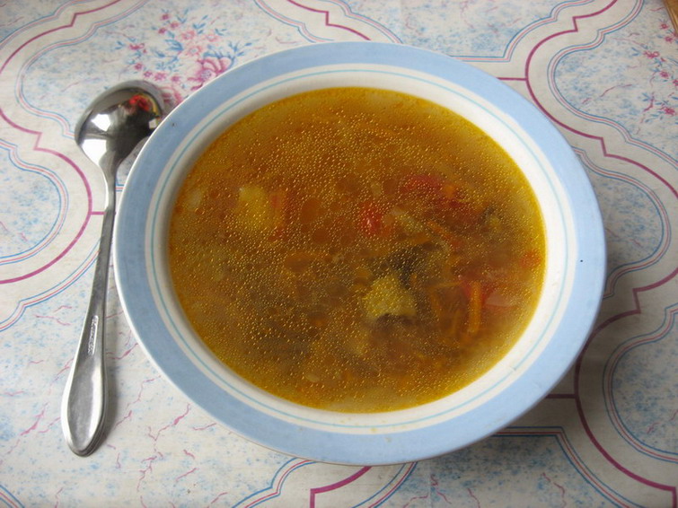 Не отключая огонь, половину из того, что у нас лежит на сковороде, перекладываем в кастрюльку. Поскольку в супе лишнее масло совершенно не нужно, берем либо специальную ложку, с дырочками, либо пользуемся обычной, но, набрав в неё зажарку, не торопимся, а, прислонив к стенке сковороды, чуть наклоняем и ждем несколько секунд, давая стечь излишкам масла. Только после этого выкладываем содержимое ложки в кастрюльку.