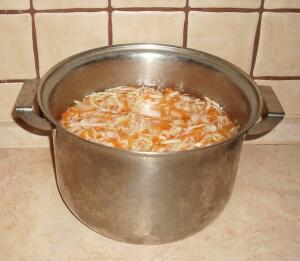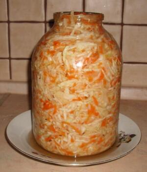 Итак, рецепт: нашинковать капусту (2,5 кг), натереть на крупной тёрке морковь (0,1−0,3 кг, по вкусу), смешать всё в общую массу, немного посыпать тмином (не обязательно!) и сложить в нержавеющую или эмалированную (без сколов) посуду. Затем вскипятить 3 л очищенной воды. Добавить в горячую воду соль — 3 столовых ложки (примерно 70 г), размешать и остудить до комнатной температуры. Затем залить рассол в кастрюлю с капустой. Капуста должна быть покрыта рассолом.