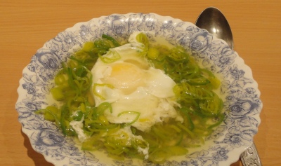 А вот как выглядит бульон с луком-пореем и яйцом Бенедикт:.
