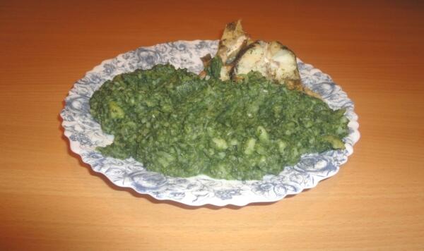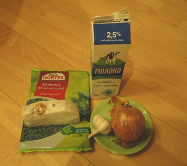 Для начала нам понадобится стандартная (900 г) упаковка замороженного шпината или килограмма 2 его свежих, широких тонких, темно-зеленых листиков на коротком, толстом и мягком стебле. Свежие листья можно поместить в горячую воду минут на 10 и потом — хорошенько отжать. Можно тщательно промыть в большом количестве воды, меняя её несколько раз. Молодой шпинат лучше тушить в собственном соку, старый — предпочтительнее отварить.