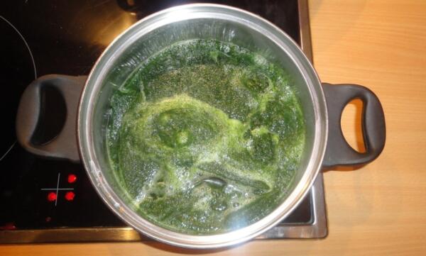 Если для приготовления этого овощного блюда используются свежие листья, то для размачивания булочки нам понадобятся сливки и только часть, 200 граммов, молока. Булочку с молоком, сливками и зелеными листьями взбиваем в блендере. Полученную смесь наливаем в кастрюлю, кипятим и параллельно готовим загуститель, который разводим не «почти» однородной массой, а оставшимися 300 граммами молока.