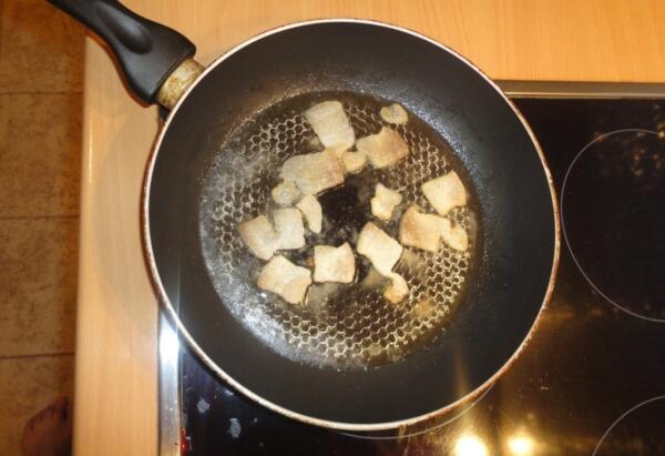Бралась глубокая чашка-бокал или пиала. В неё крошился белый хлеб (один сплошной нетолстый рез, получается 2 кусочка). К хлебу добавлялось 2 тонких кругалика колбасы, порезанных на небольшие квадратики.