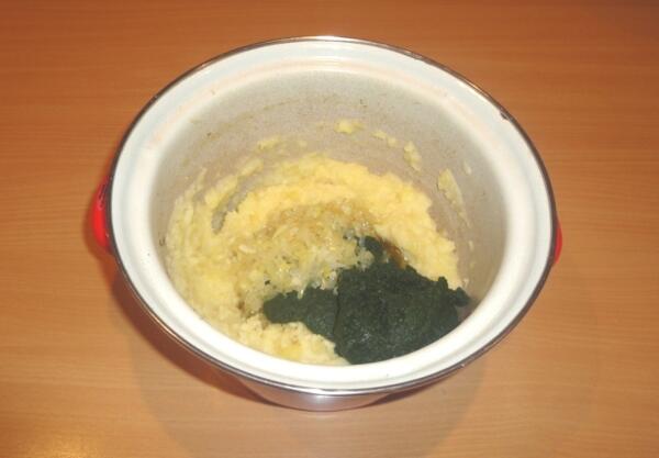 Встреча пюре, лука, чеснока и шпината за пару минут до того, как они станут единым и неделимым гарниром.