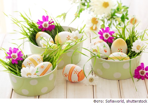 3. Какой же пасхальный стол без традиционных крашеных яиц и кулича? Способов покраски и украшения яиц (как и выпечки куличей) существует огромное множество. Между тем, крашеные яйца будут смотреться ярче и оригинальнее, если их выложить на тарелку со свежей зеленью (соорудить так называемую полянку и создать нечто похожее на весеннюю травку).