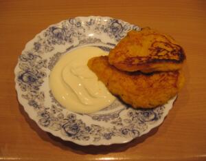Сколько их там у нас? Стакана полтора? Тогда добавляем к ним стакан просеянной через ситечко пшеничной муки, стакан кефира, 2 яйца, столовую ложку сахара, пол чайной ложки соли, ¼ ч.л. соды и замешиваем тесто на оладушки. Тыквенные!