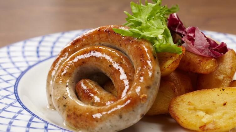 Наполнить оболочку для колбасок полученным фаршем. Скрутить колбаски в виде спирали и заколоть зубочисткой, чтобы спираль не разматывалась. Чтобы в процессе запекания колбасы оболочка не лопалась, ее надо проколоть в нескольких местах тонкой иглой. Положить колбасу на смазанный маслом противень и поставить в духовку. Духовку необходимо предварительно разогреть, тогда колбаски получатся сочнее. Время приготовления — приблизительно полчаса, затем перевернуть и запекать еще минут 20. Можно колбаски не переворачивать, просто через полчаса включить режим гриль (если он есть в вашей духовке).