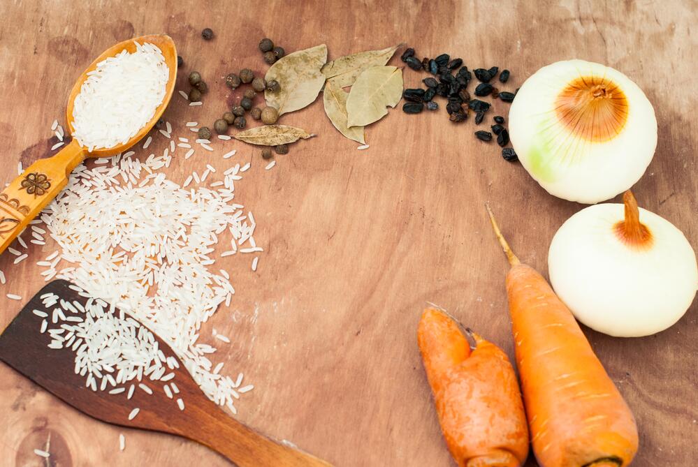На полтора стакана риса нужно взять примерно пять-шесть средних морковин и три-четыре средних луковицы. Не бойтесь перебавить, это не ухудшит вкус плова. Плов у нас овощной. Можно добавить сладкий болгарский перец, помидор, но это как приправа, главное — лук и морковь.