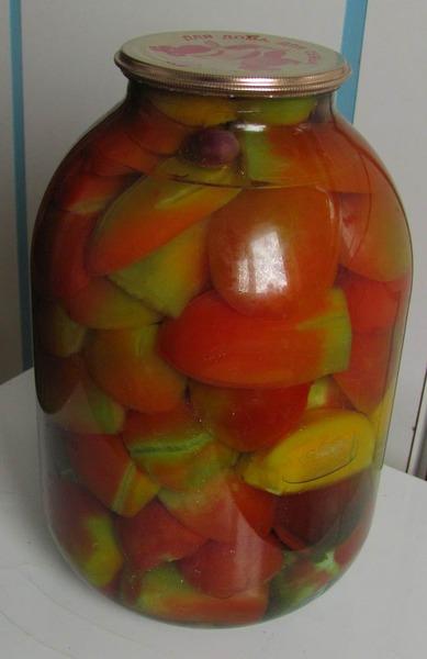 Для его приготовления отбираем плотные, даже слегка недозрелые помидоры, разрезаем их пополам или на крупные дольки и плотно укладываем в банки слоями, чередуя с кольцами репчатого лука.