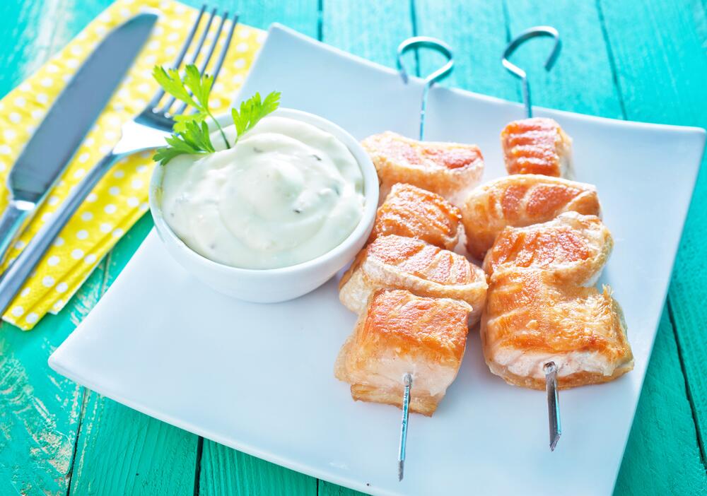 Рыбу, сняв с нее кожу и удалив хрящ, нарезать на кусочки по 40 — 50 г. Перемешать рыбу с натертым на терке репчатым луком, перцем и солью, нанизать на шампуры и жарить в течение 10 минут.