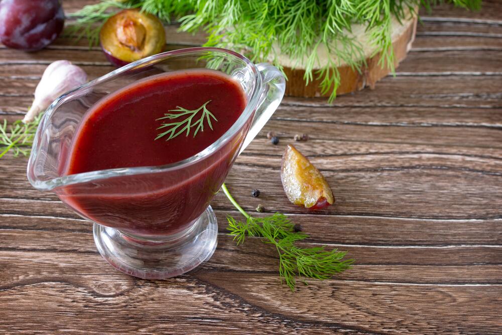 Перебранные, промытые сушеные сливы кладут в кастрюлю, заливают водой так, чтобы она только покрывала их и варят. Отвар процеживают, сливы без косточек протирают через сито, разводят отваром до густоты сметаны, добавляют толченый чеснок, молотый перец, мелко нарезанную зелень, соль, стручковый перец, перемешивают, кипятят и охлаждают.