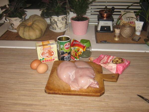 Итак, приступим. Нам понадобится куриное филе — у меня в этот раз вышло около 700 граммов, «бюст» здоровенного бройлера. Режем мясо небольшими кусками, очищаем 2−3 зубчика чеснока, подготавливаем 2 сырых куриных белка, 2 столовых ложки крахмала, соль, перец, любимые специи и сливки граммов 200 — в идеале 33-процентных. Но я брала и 10-процентные, и просто молоко — все равно получалось. Обязательно подготовьте молотый мускатный орех — хорошую щепотку.