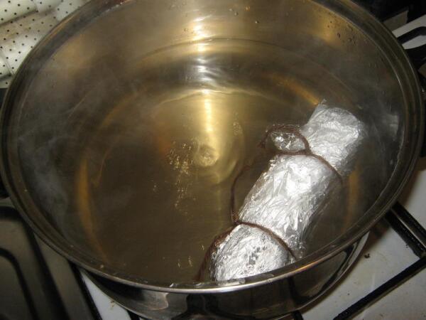 Перевязываем полученные «колбаски» шпагатом или нитками — туго, и опускаем в кипящую воду. Варить колбасный полуфабрикат нужно минут 30−40. Время истекло? Выкладываем на решетку или на более-мене ровную поверхность и остужаем. Собственно, оно само и остужается.