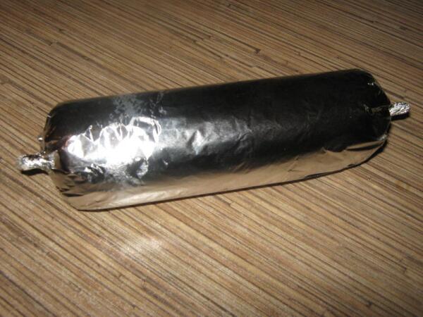 Дальше сложнее — полученную довольно жидкую массу следует упаковать в фольгу. В «фольговые» тубы, если быть точнее. Масса довольно текучая, но при известной сноровке скатать из нее «батончики» вполне возможно. У меня получается.