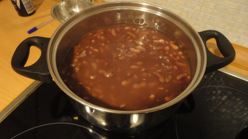 Многие кулинарные сайты утверждают, что фасоль надо замачивать на ночь. Я этого никогда не делаю. Утром замочил, после обеда — чуть погодя, с таким расчетом, чтобы к ужину управиться — начал готовить. Часа полтора даже для красной фасоли — а она всё-таки потверже белой — вполне достаточно, чтобы она сварилась.