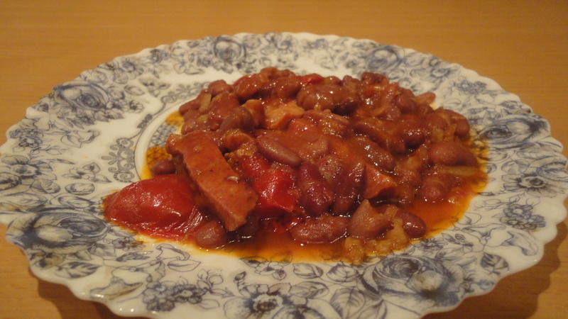 У меня, видно, потому, что и помидоры в собственном соку, и колбаса, и грудинка были солеными, дополнительно присаливать блюдо не понадобилось. И хотя фасоль варилась в несоленой воде (так надо, иначе любые бобовые «дубеют» и варятся очень долго), на вкус блюдо вышло замечательным. На недосол никто не жаловался.