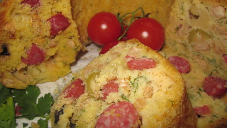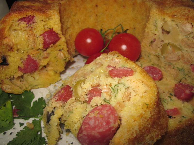 Берем для теста: 4 яйца, по столовой ложке с горкой сметаны и майонеза (вполне можно что-то одно из них), 1 стакан муки, половинку чайной ложки соли, 1 столовую ложку сахара, немного черного молотого перца и чайную ложку разрыхлителя. Для начинки берем (допустим): баночку (полбанки) консервированной фасоли, несколько маслин и оливок, граммов 50−100 твердого сыра, несколько копченых колбасок (типа охотничьей или ветчины) и немного любой зелени. Сливочное масло и панировочные сухарики — для подготовки формы для выпечки.