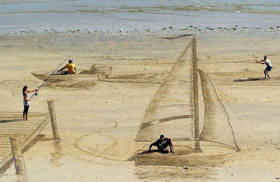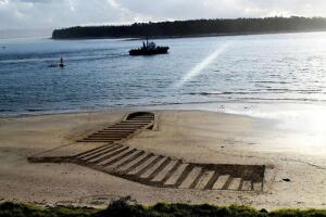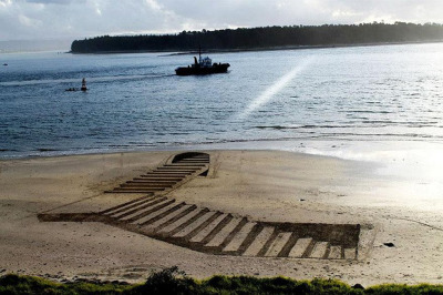 Еще несколько лет назад люди восхищались 3D-рисунками на асфальте. На сегодняшний день это уже мейнстрим. Художники ищут все новые и новые формы отображения искусства, чтобы в очередной раз удивить искушенного зрителя. Так произошло с группой новозеландских энтузиастов (Ben Harkins, Lucia Lupf, David Rendu, Constanza Nightingale). Вдохновившись 3D-рисунками на асфальте, они решили сделать то же самое, но на песке.