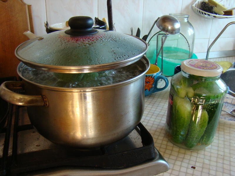 Подготовленные банки ставим в кастрюлю с холодной водой, на дно которой постелена салфетка. Включаем газ — или что у вас там, и доводим воду в кастрюле до кипения. Стерилизуем пять минут с момента закипания воды — в кастрюле, а не в банке.