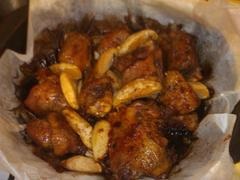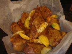 Приготовление. Конечно, птица должна быть осмолена. Если где-то остались пеньки, то прибегаем к женским хитростям и удаляем их пинцетом. Хорошенько вымыть, обсушить и порезать на куски. Можно попросить добытчика разрубить, пусть почувствует свою мощь. Потом обильно посыпать приправами. Посолить при этом немного, так как потом еще будет соевый соус, а он сам по себе соленый.