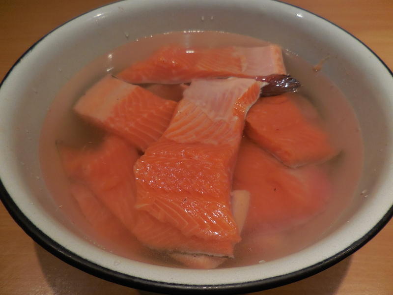 В общем, разводим соль с сахаром в воде и заливаем этим раствором порционные кусочки нашей форели. Теперь ей, чтобы просолиться, минут 25 (не менее 20, но не более 30) надо постоять. Ей. Но не нам. О гарнире не забыли?